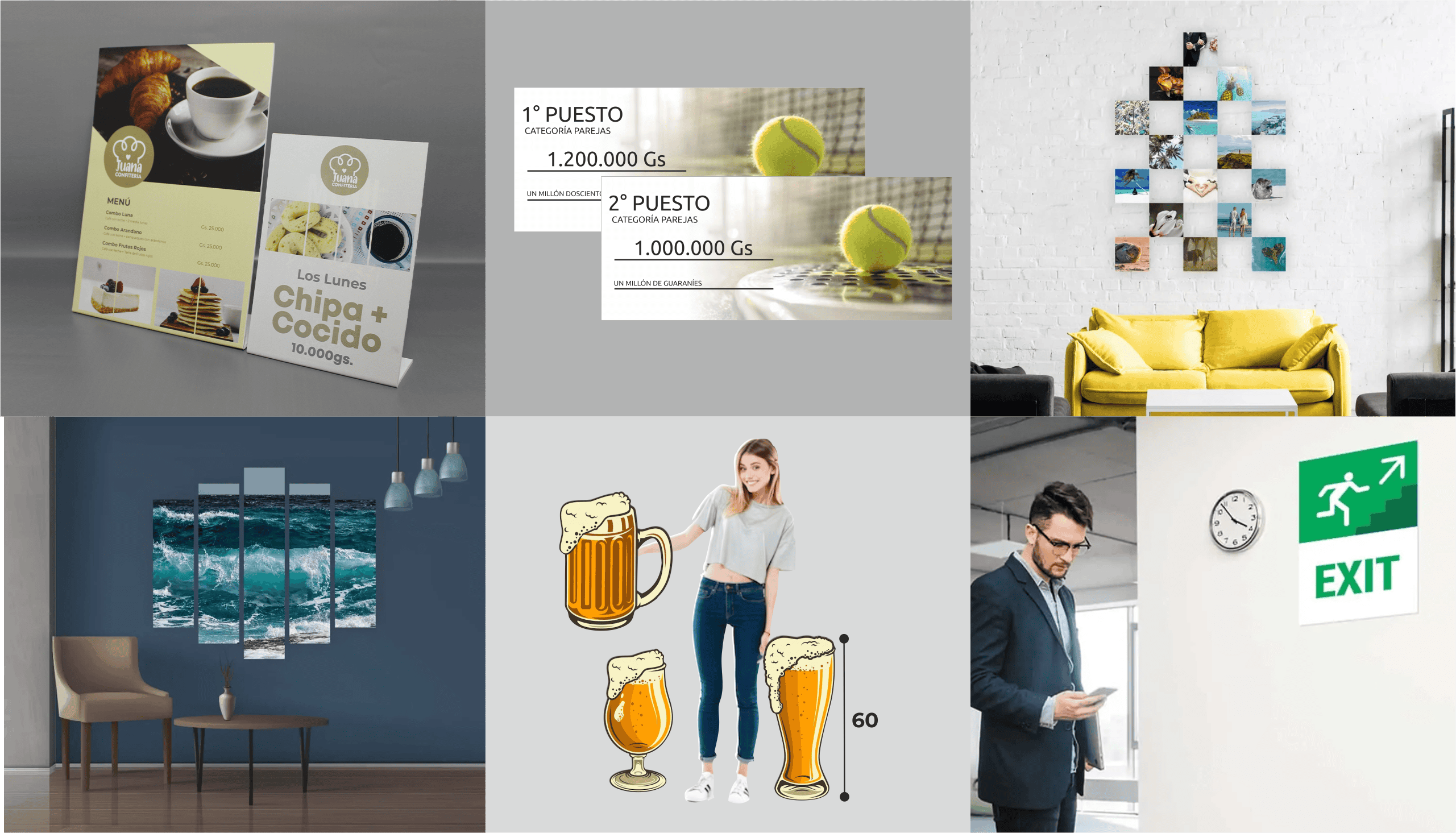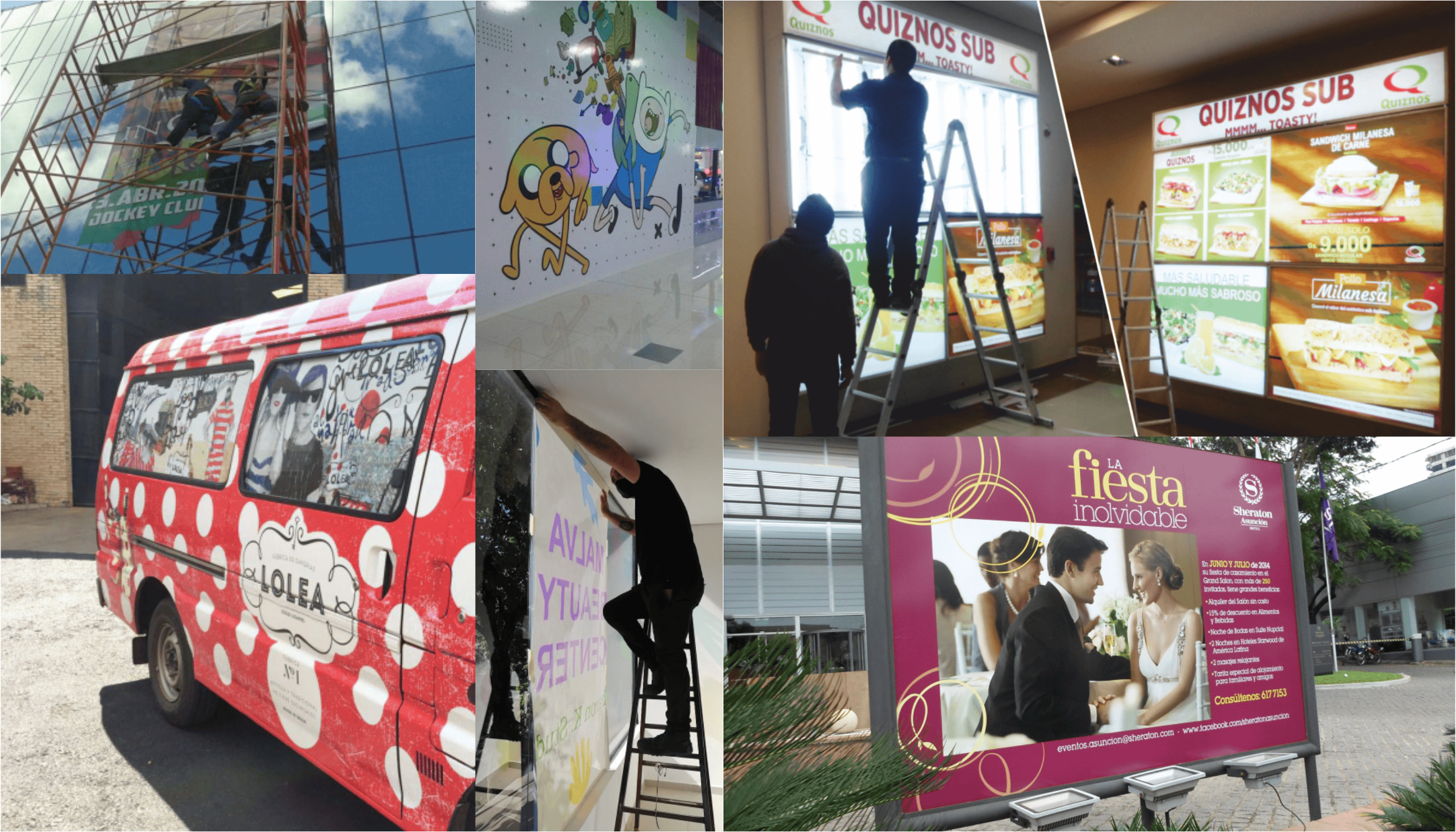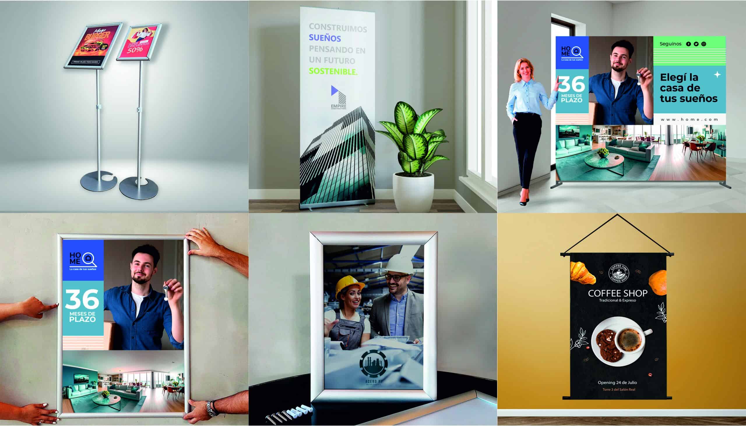 Materiales: adhesivo vinílico blanco, transparente, reflectivo, papel fotográfico, lona vinílica, esmerilado, tela poliéster, microperforado y tela canvas. Estructuras de metal, mdf, pvc y acrílico.