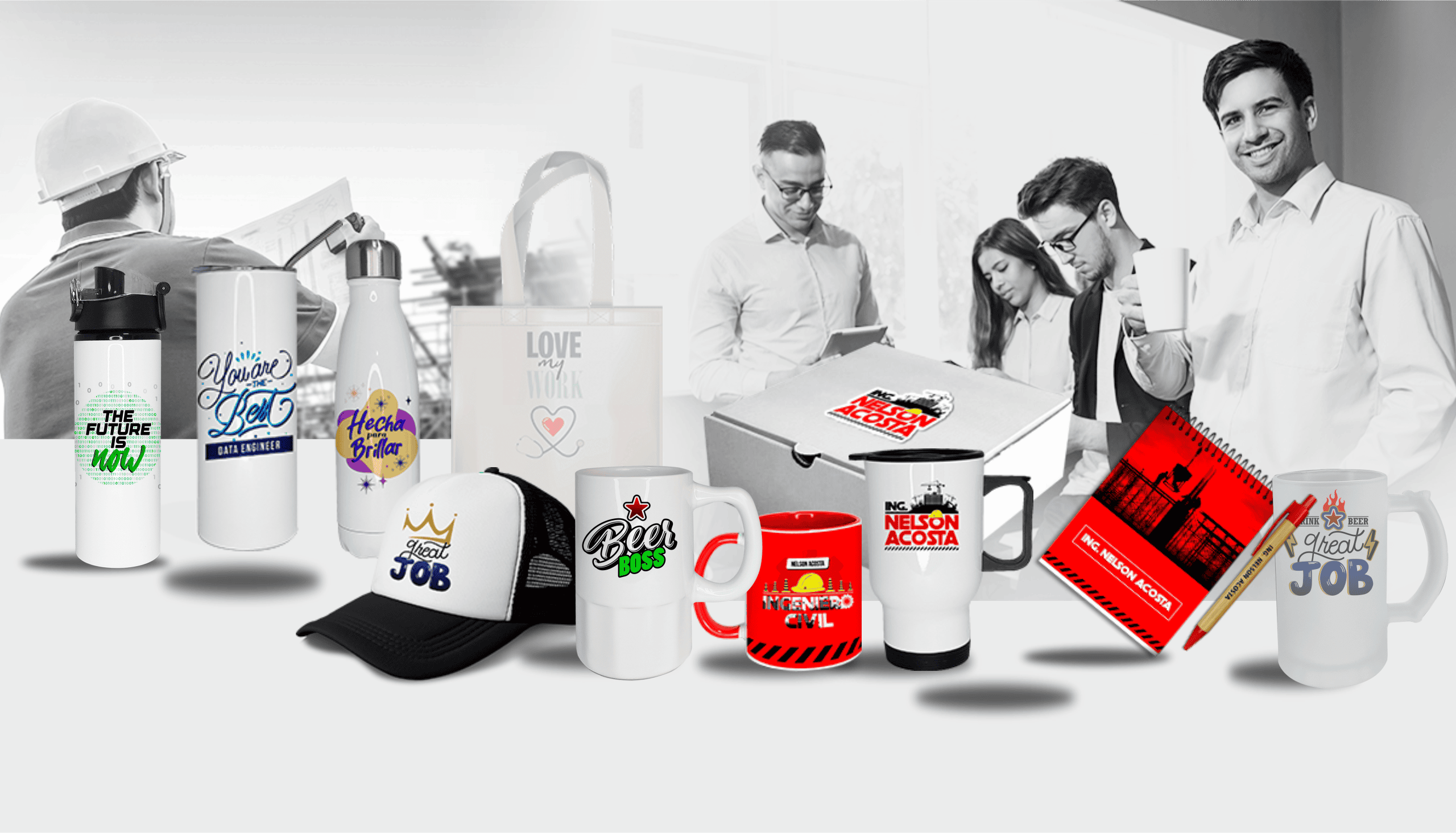Materiales: tazas de cerámica, vasos y botellas de acero inoxidable, choperas de cerámica y de vidrio, bolsas y mochila de tnt, mouse pad y bolígrafos.